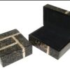 A box in a modern design made of ‘baloko’ shells with a decoration of golden capiz. 12.5 x 12.5 cm.