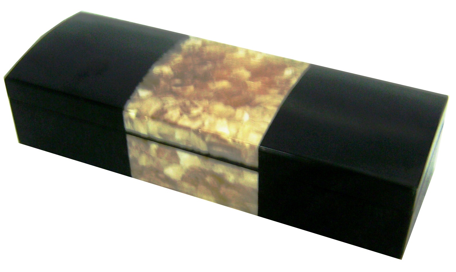A luxurious watch case with recesses in golden capiz. 38 x 12.5 x 9 cm height.